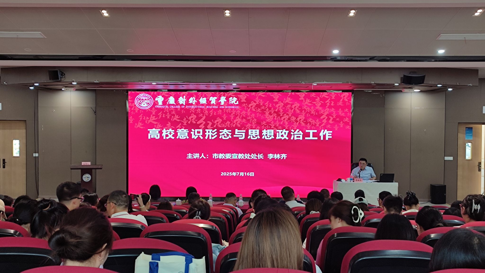 为深入学习贯彻习近平新时代中国特色社会主义思想和党的二十大、二十届三中全会精神,全面落实习近平总书记关于教育的重要论述,7月16日下午,重庆对外经贸学院邀请重庆市教委宣教处处长李林齐,作《高校意识形态与思想政治工作》专题报告。报告会由重庆对外经贸学院副校长李川主持,学校宣传部、学生处、保卫处、团委、马克思主义学院等相关部门负责人,以及学校辅导员、思政课教师代表参加。