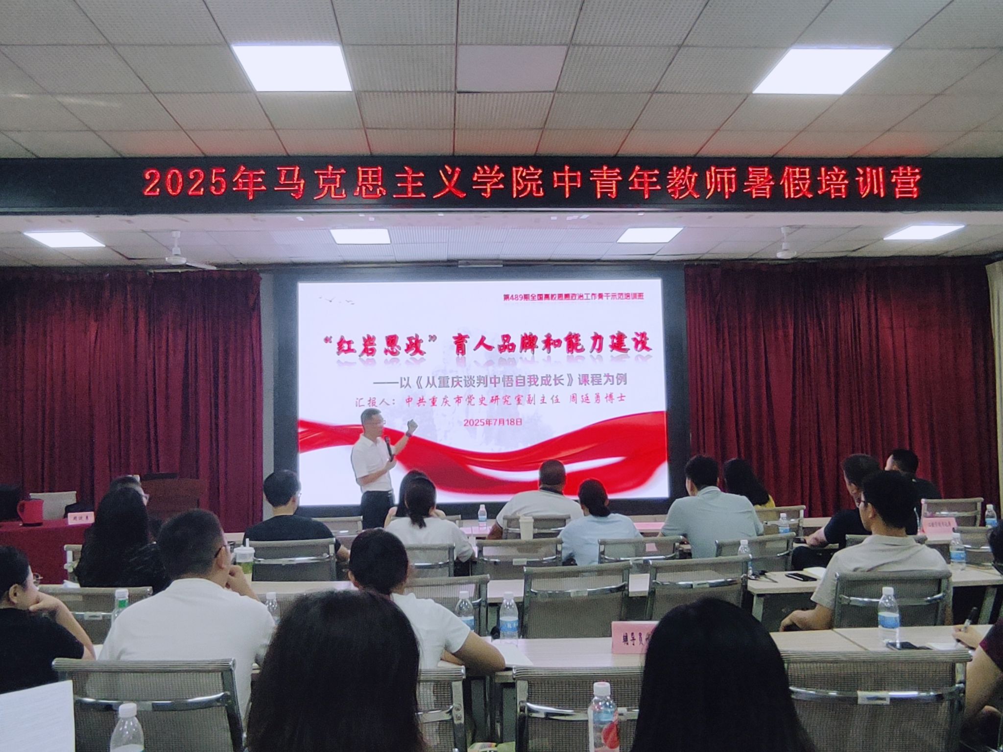 红岩精神蕴含着党的优良传统与红色基因,是重庆最具鲜明特色的红色标识。为深入挖掘红岩根脉,让思政课入脑入心,7月18日下午,中共重庆市委党史研究室副主任周廷勇受邀为重庆对外经贸学院马克思主义学院教师作专题培训。讲座以《“红岩思政”育人品牌和能力建设》为主题,聚焦课程案例“从重庆谈判中悟自我成长”,通过史料剖析、品牌路径与实践能力三维框架,为学院思政课教师一堂红岩思政示范课。